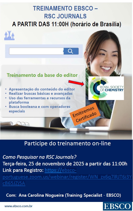 Visando promover o acesso à informação científica e tecnológica por meio do Portal de Periódicos da CAPES, a BVS Rede de Informação e Conhecimento oferece, com o apoio da EBSCO Information Servides, treinamento específico da plataforma RSC Journals.